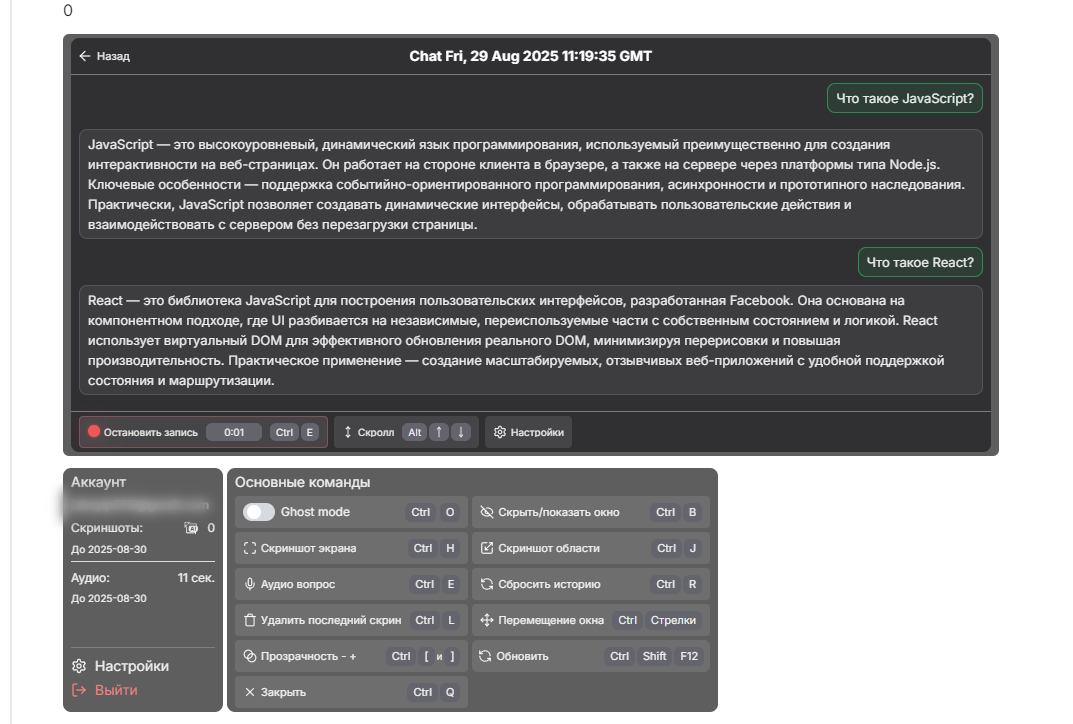 Приложение полностью незаметно на экране — его не видно в записи, стриме или трансляции. Оно пропускает клики, не отнимает фокус у редакторов кода.